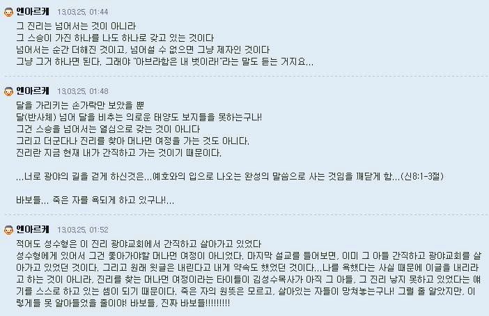 아래는 김성수 목사님이 언급한 '후배 아이' 가 그들의 게시판에 올린 답글입니다.